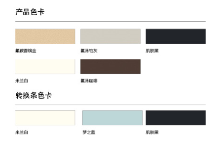 産品色卡:氟碳香槟金、氟泳鉑灰、肌膚黑(hēi)、米蘭白(bái)、氟泳咖啡
